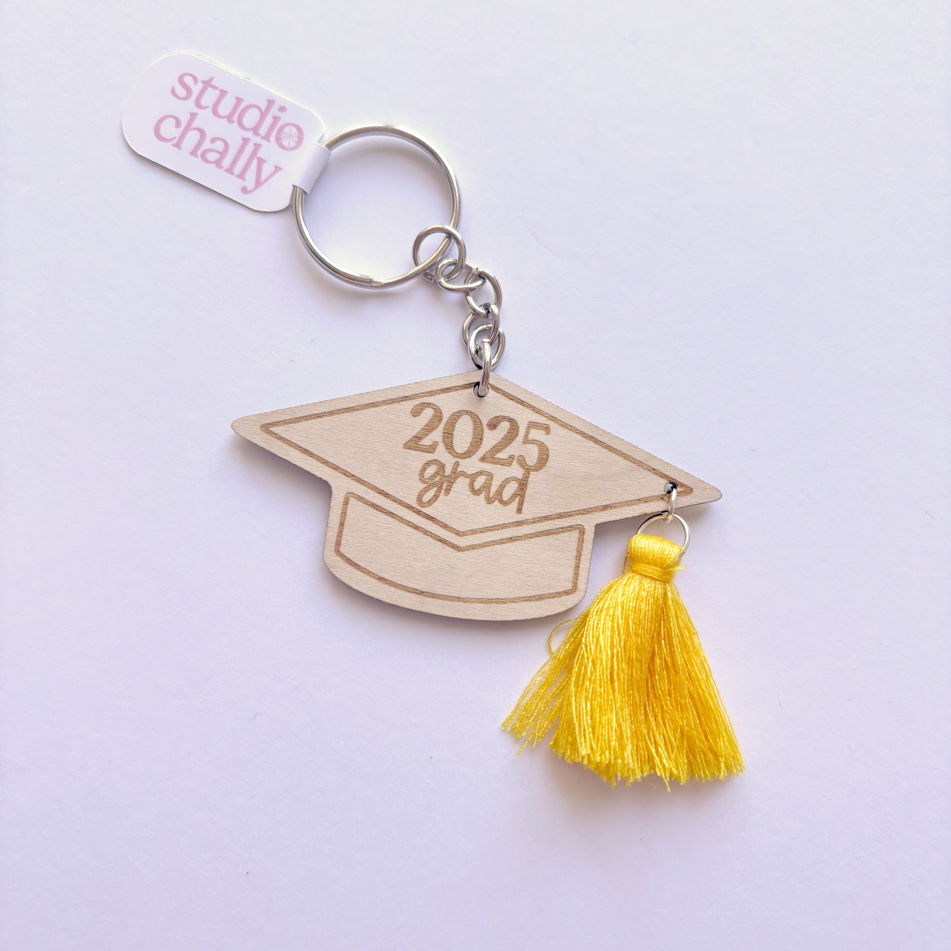 Featuring the text '2025 Grad', our wooden keyrings are made from engraved 3mm plywood. Measuring 7.5cm wide by 3.5cm tall, each keyring is finished with a tassel colour of your choice, and silver keyring hardware - ready to gift! Ordering a class set? Add over 10 graduation keyrings to cart and a 25% off bulk discount will be applied at checkout. Selecting 'Assorted/Random' may include tassel colours outside of our set range.ย