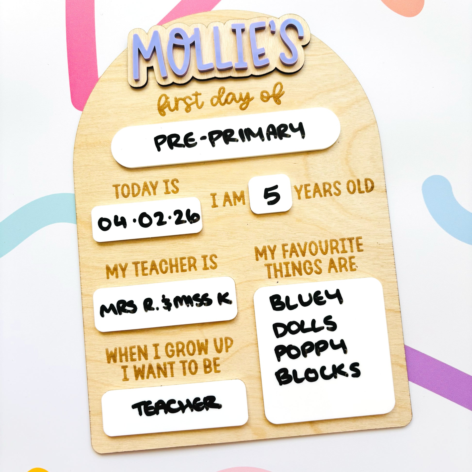 Our large interchangeable back to school board is a thoughtful way to capture school milestones for every child in the family. Designed with siblings in mind, the personalised name can be easily swapped using velcro â making it a practical, long-lasting keepsake youâll use year after year. (One name included; additional names can be purchased here)