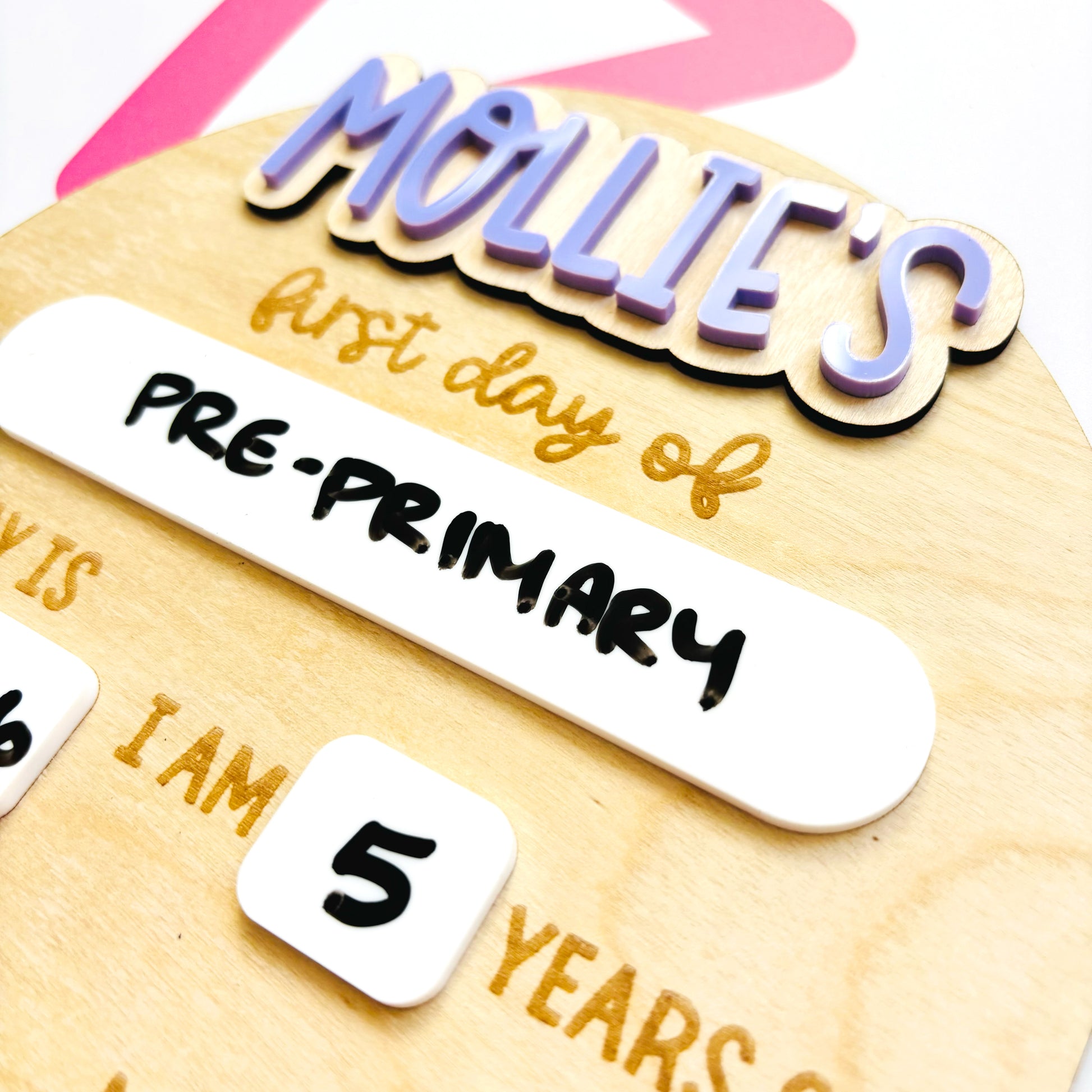 Made from layered 3mm plywood and glossy acrylic, each board measures 18cm wide by 25cm tall. It features acrylic whiteboard panels to record the little details that are so easy to forget as the years pass. This design is also available with interchangeable First Day and Last Day banners, complete with an extra velcro strip on the back to keep unused pieces safely stored. Pen not included.
