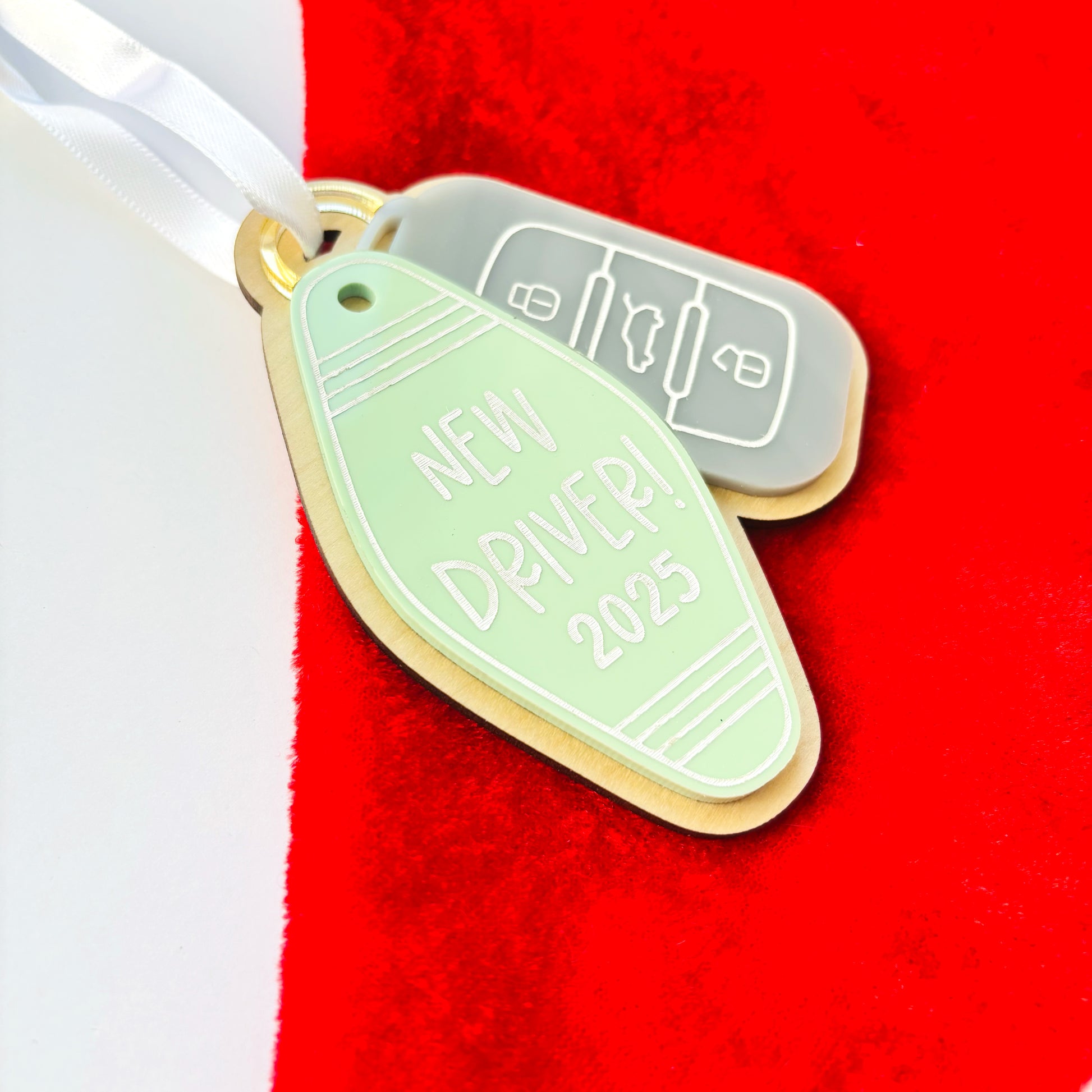 Know a P-plater? Commemorate the milestone this Christmas with our car key Christmas ornament! Simply select the year, acrylic colour for the keyring and colour for the engraved and paint filled details, and we'll do the rest! Pictured is a pistachio keyring with white engraved details, car key comes in grey as standard. Ornaments measure 8.5cm by 10.5cm, and are finished with white silk ribbon ready to display.ย
