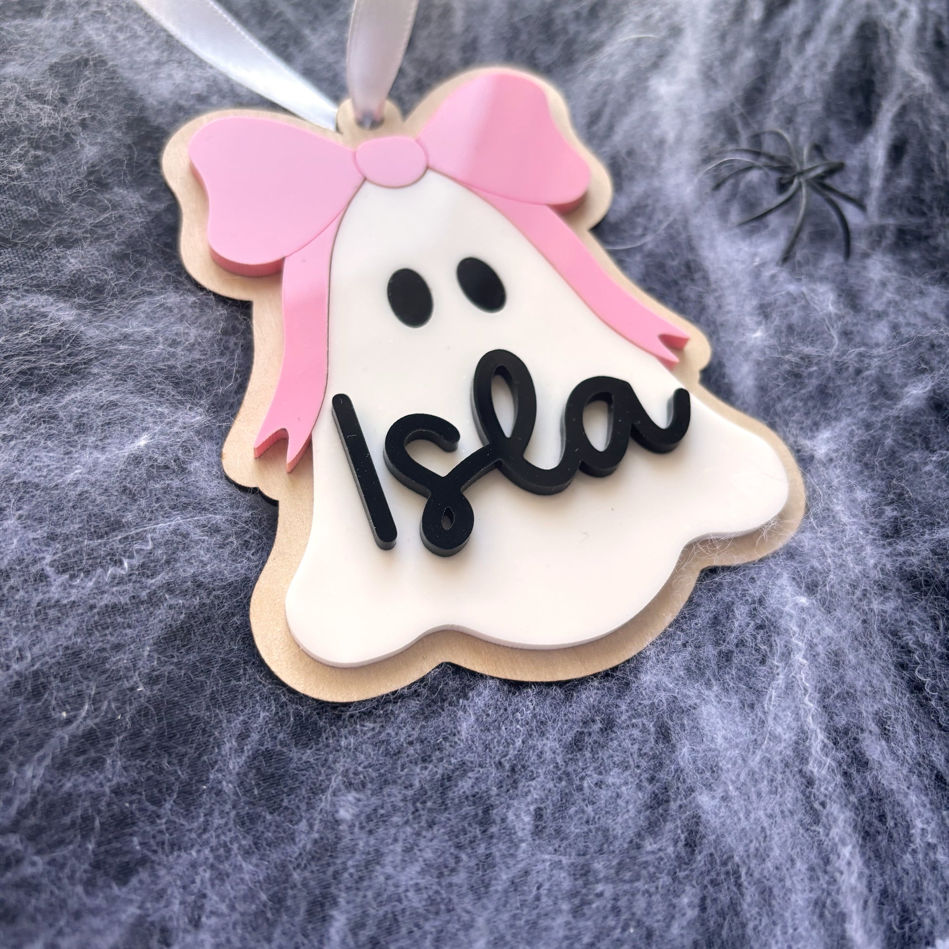 Ensure their halloween treats don't get mixed up with our basket name tags! Each bow Ghost tag measures 8cm wide by 10cm tall and is finished with white ribbon ready to add to their basket. Featuring layered glossy acrylic on a plywood backing, these tags are made to be reused for years to come!Â