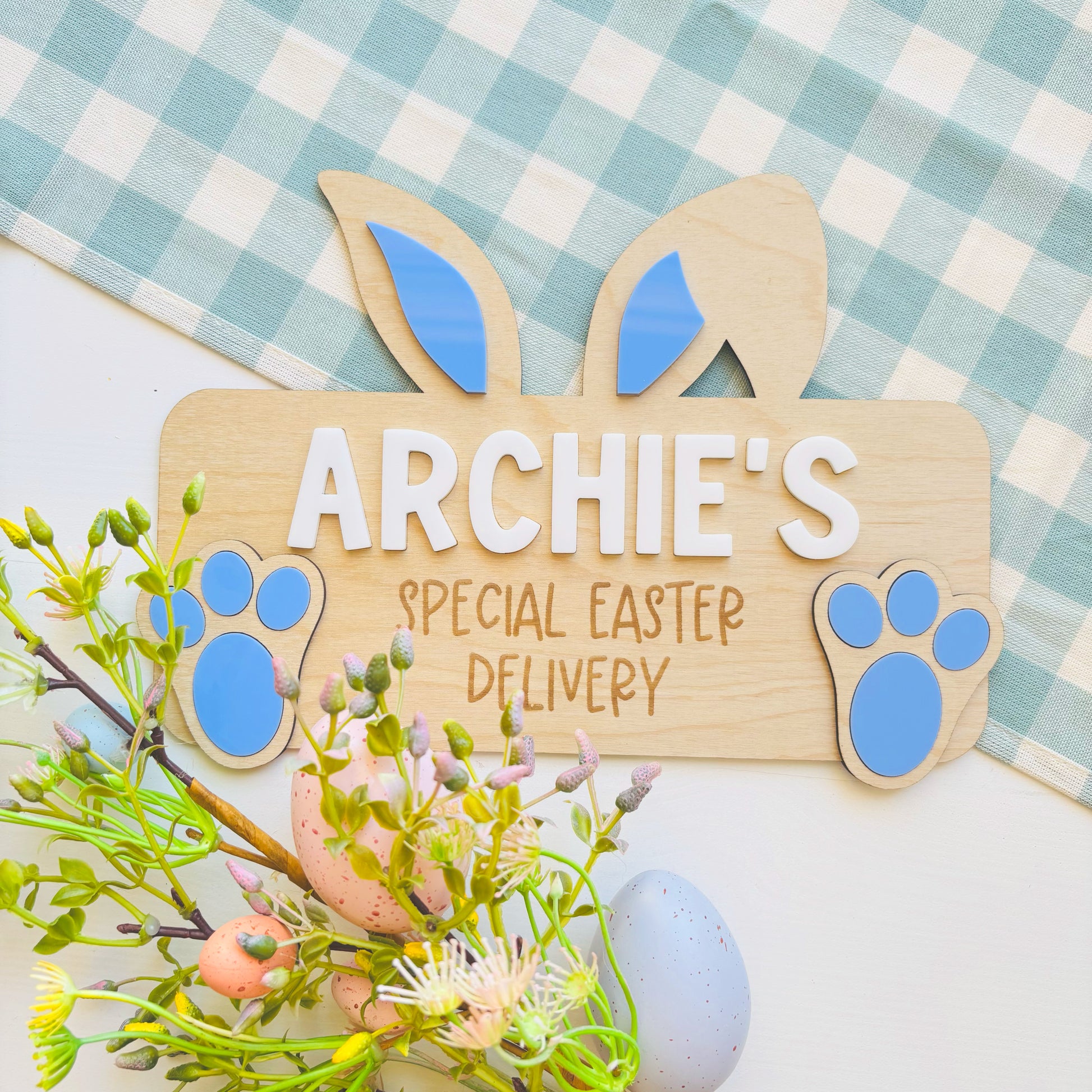 Make your childâs Easter crate extra magical with our Personalised Easter Crate Plaque! This festive plaque features bunny ears and feet, with the acrylic details in your choice of colour and childâs name in bright white, making it a fun and personalised keepsake that will delight little ones year after year.