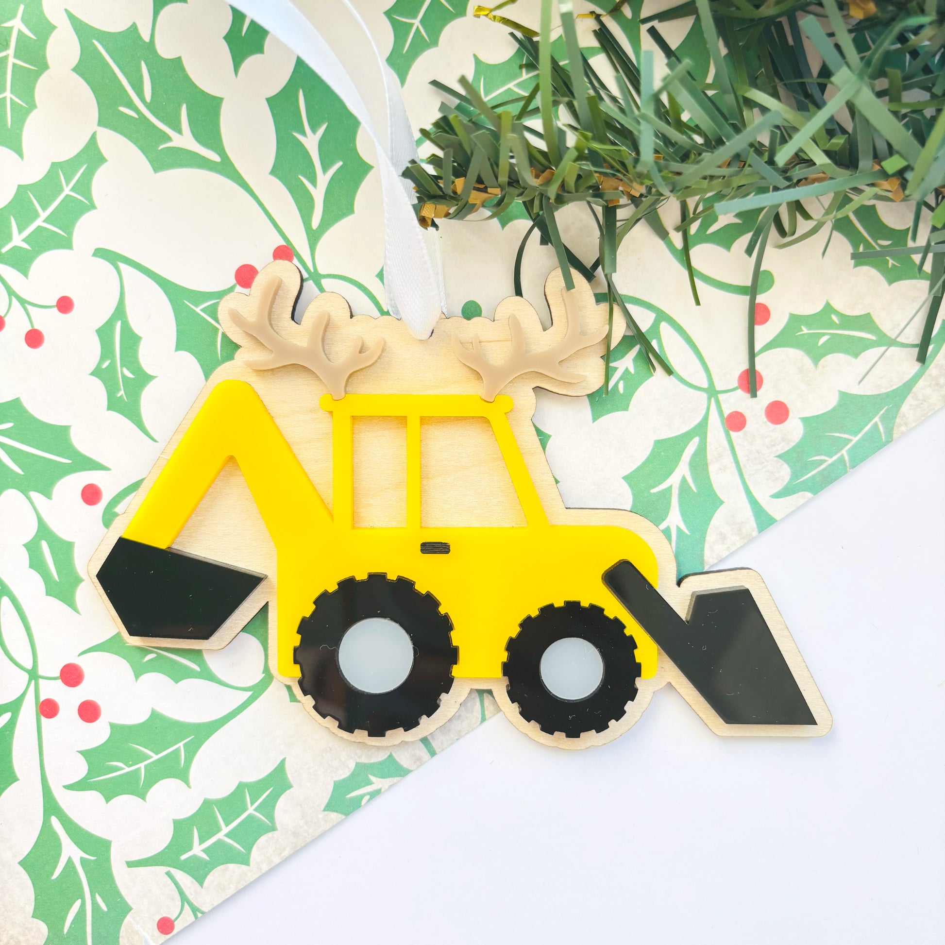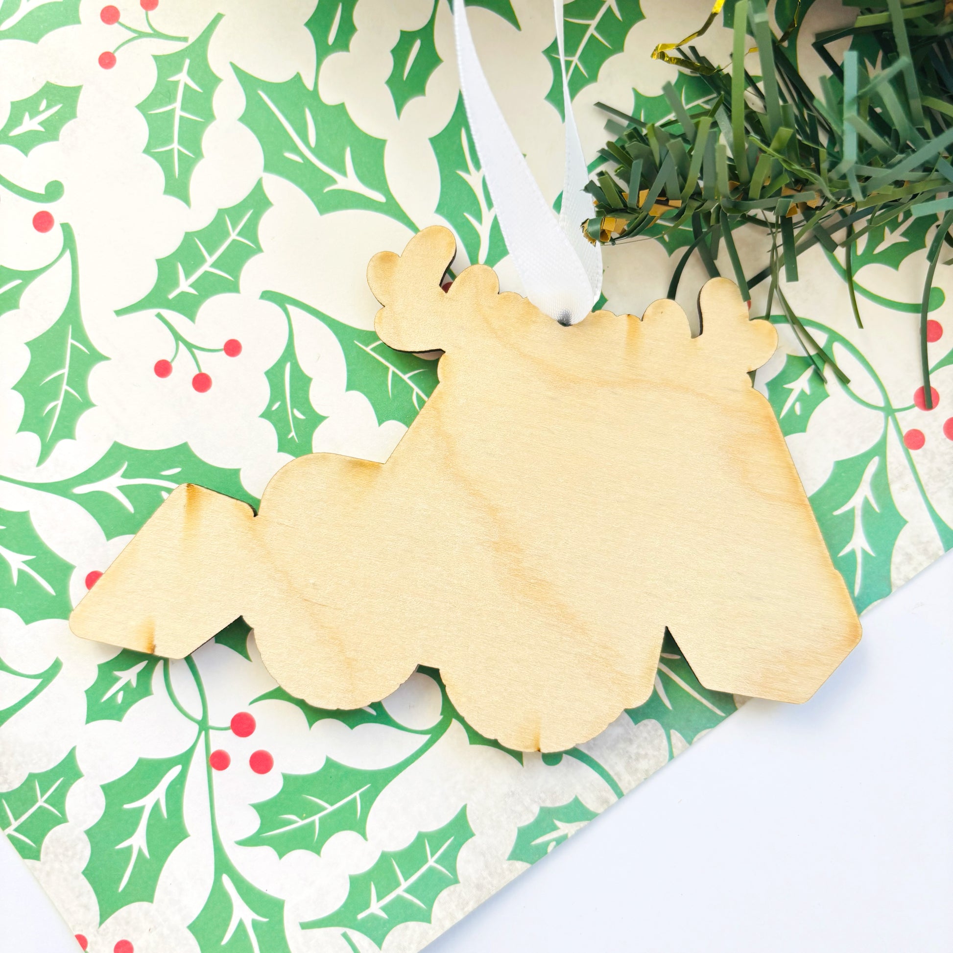 Ornaments are made from layered 3mm plywood and glossy acrylic, with an optional name in white acrylic for a personal touch. Each ornament measures 12.5cm wide by 8cm tall, and is finished with white silk ribbon ready to hang!