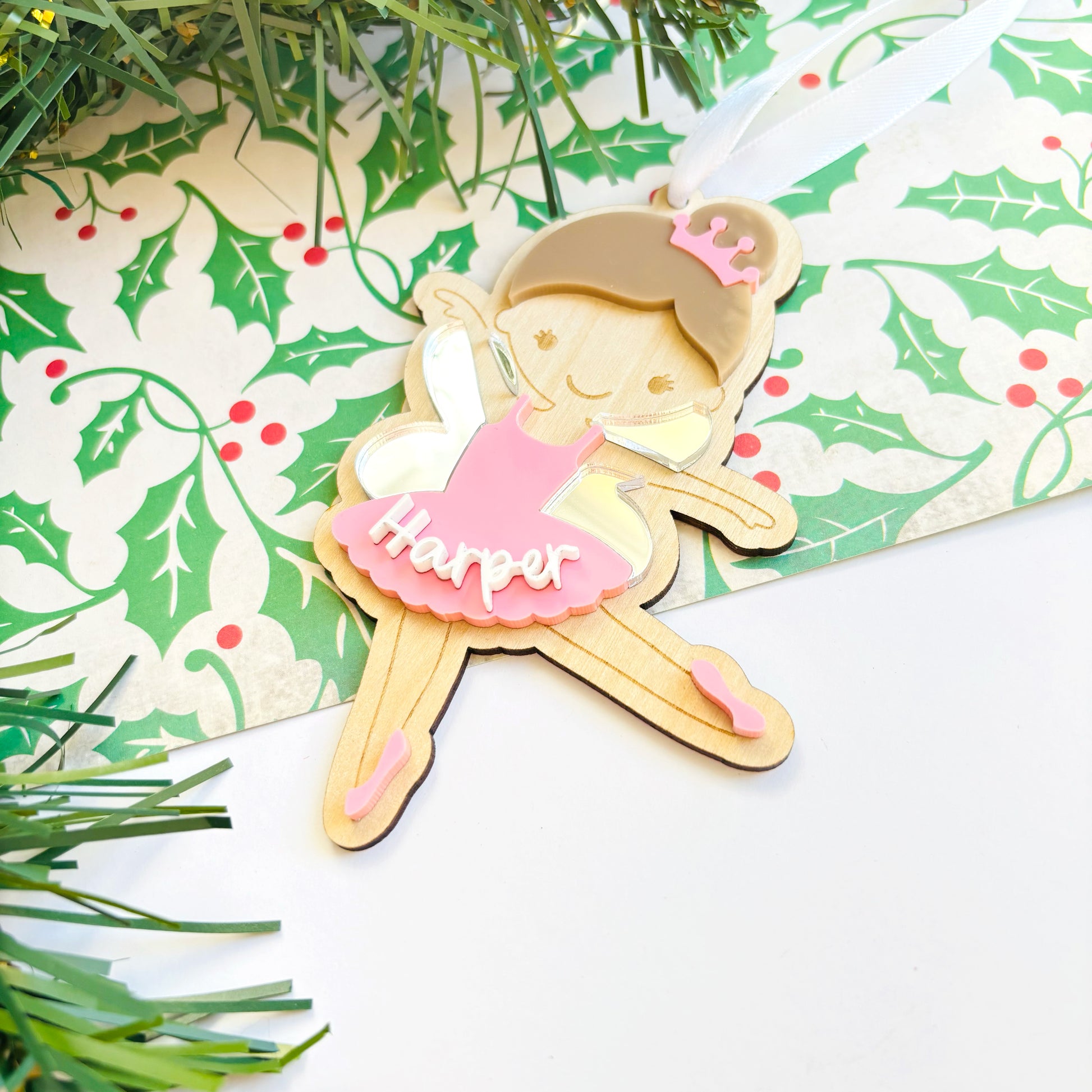 Ornaments are made from layered 3mm plywood and glossy acrylic, with an optional name in white acrylic for a personal touch. Pick from 29 acrylic colours for the fairy dress, shoes and crown to match your Christmas theme (pictured is strawberry, wings are silver mirror and hair is cappucino as standard). Each ornament measures 8cm wide by 11.5cm tall, and is finished with white silk ribbon ready to hang!