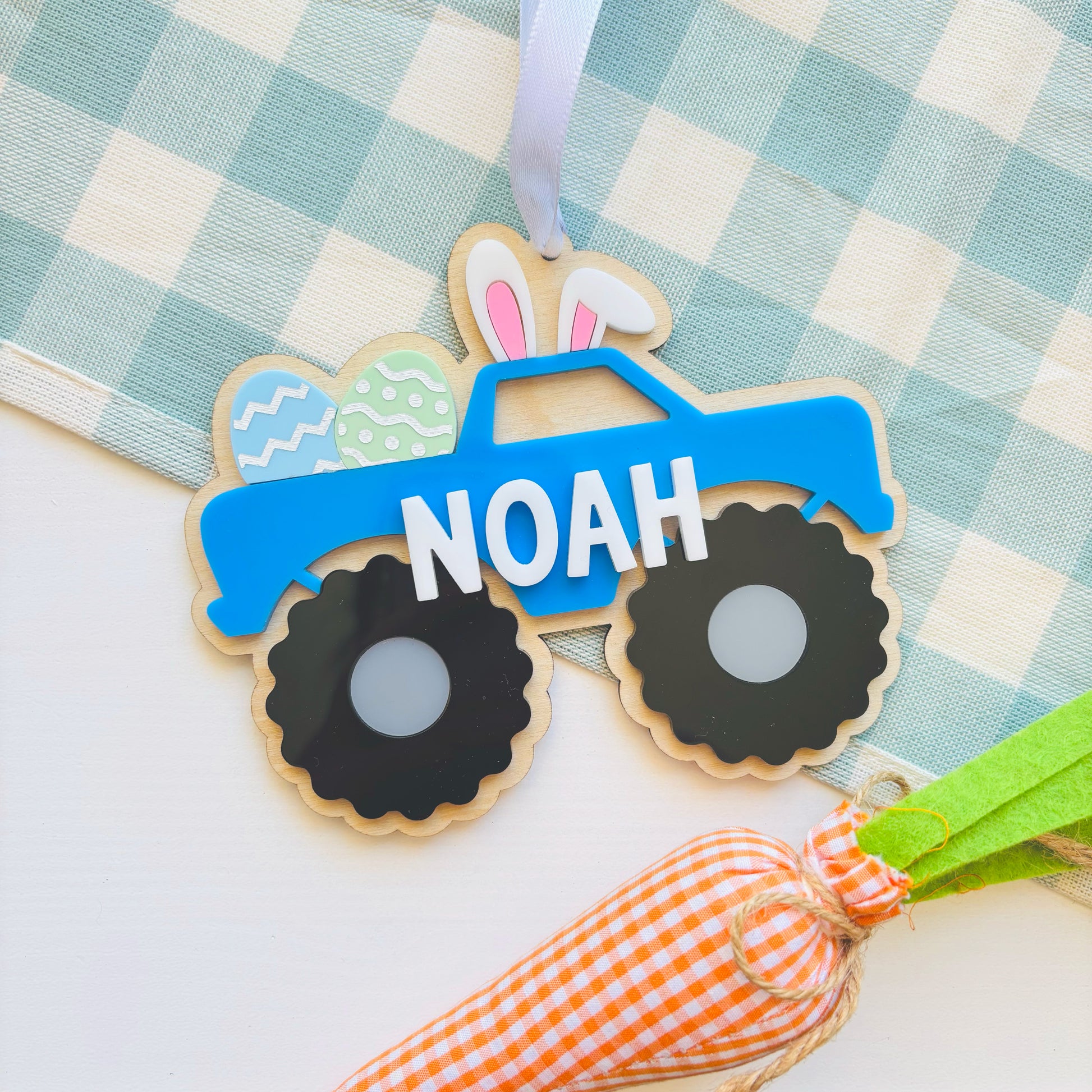 Rev up Easter morning with our Personalised Monster Truck Easter Tag! Featuring bunny ears and a load of Easter eggs in the back, this fun, festive tag makes any basket extra special. The child’s name is displayed in white acrylic on top, and the truck can be personalised in your choice of colour (shown in royal blue). The Easter eggs come in candy floss blue and pistachio green as standard, with engraved and paint-filled details that add extra charm and personality.