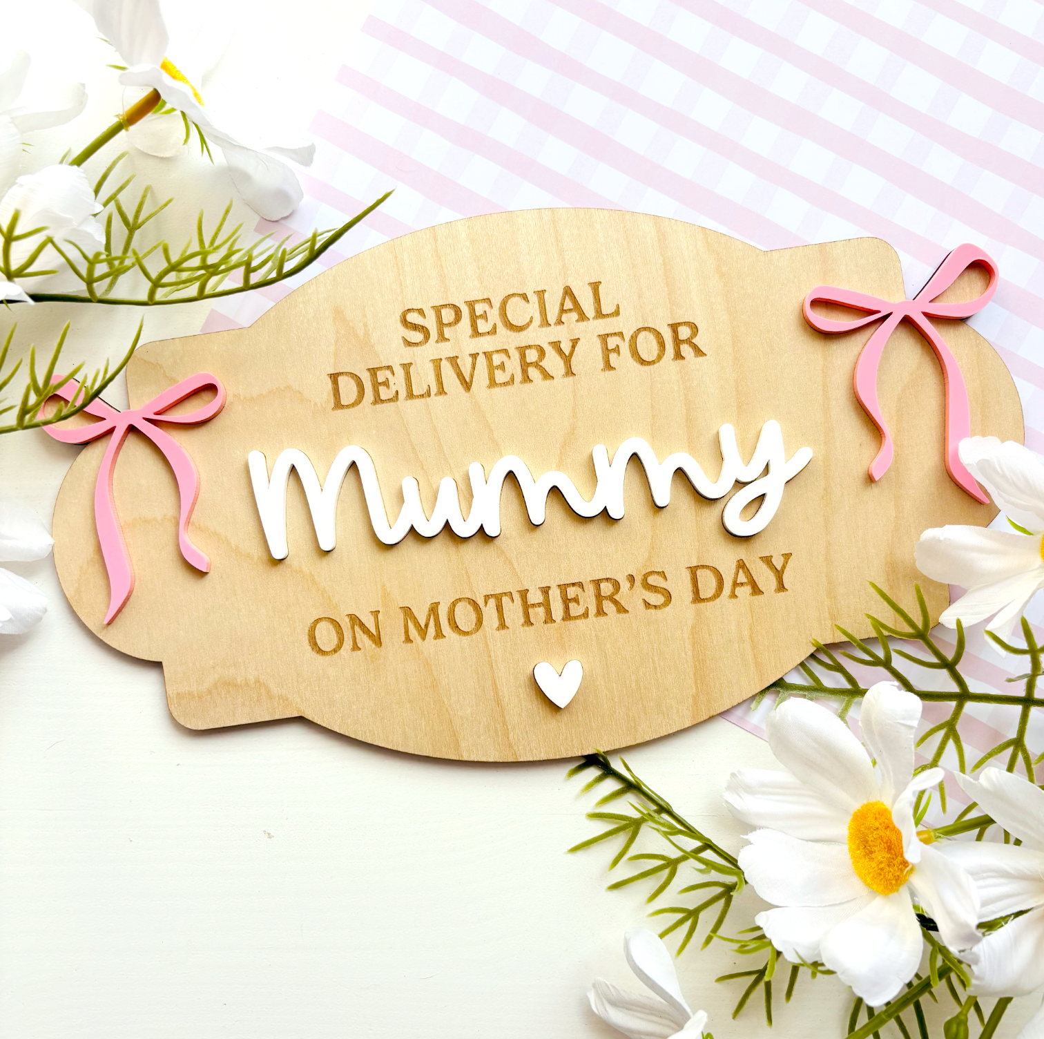 Make her Mother’s Day gift even more memorable with our “Special delivery for (Mummy, Grandma, Nanna, etc.) on Mother’s Day” crate plaque — the perfect finishing touch for a beautiful hamper or gift basket. Thoughtfully designed to suit any special name, this piece adds a personalised and heartfelt detail she’ll truly treasure.