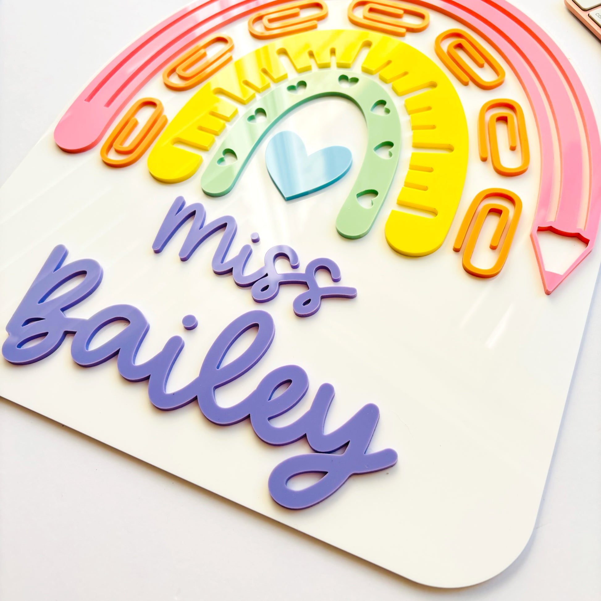 Our personalised rainbow teacher sign measures 28cm wide by 31cm tall and is made from layered 3mm pastel acrylic. Personalised with your teacher's name, these are perfect to display on a door, wall or whiteboard.