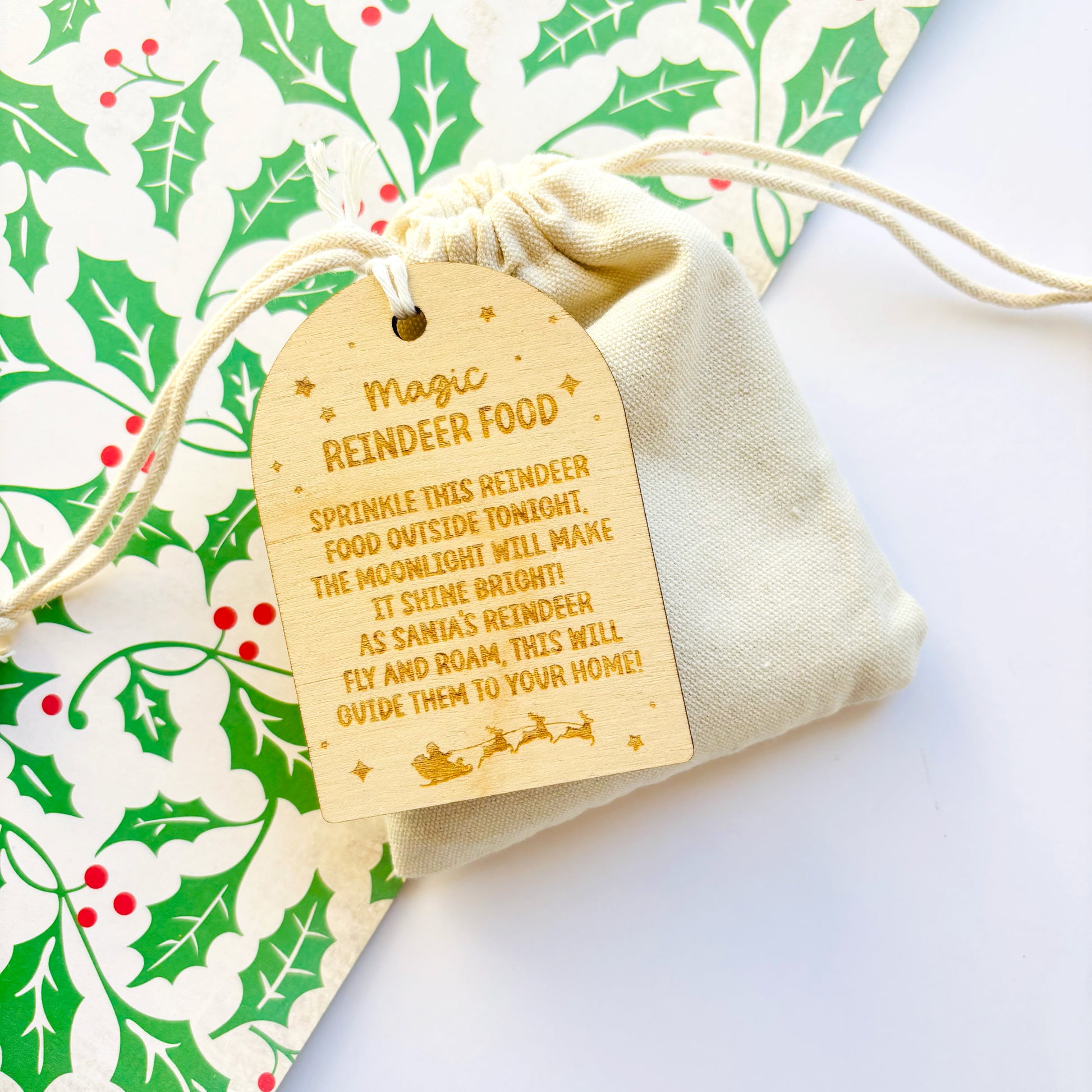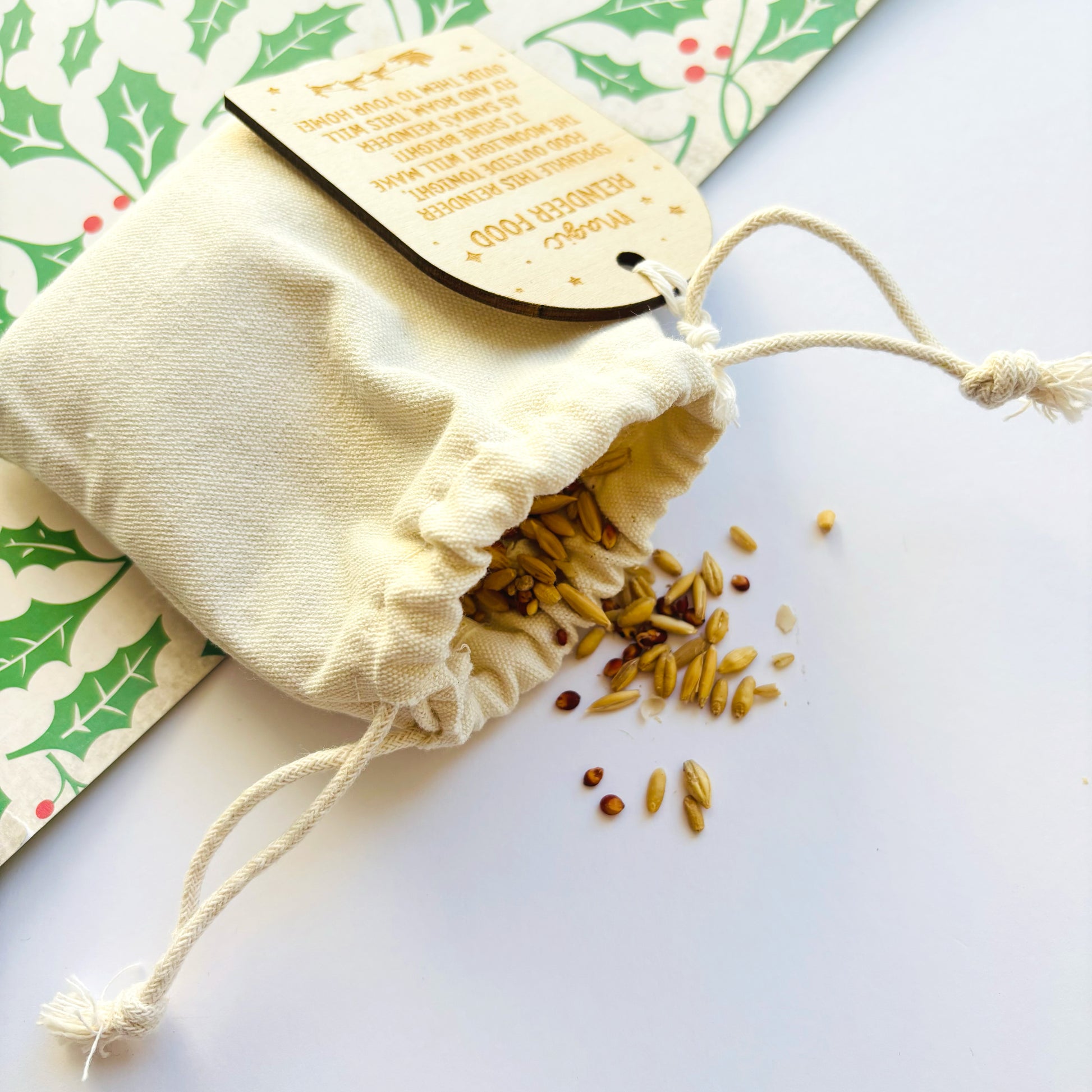 Our reindeer food is ready to sprinkle on Christmas Eve! Each bag contains 80grams of 'reindeer' food - a mix of wheat, barley, oats, sorghum, hulled oats, millets, corn and sunflower seeds - making it wildlife friendly! Bags measure 10cm wide by 12cm tall, and are finished with an engraved tag. These make the perfect addition to Christmas Eve boxes!