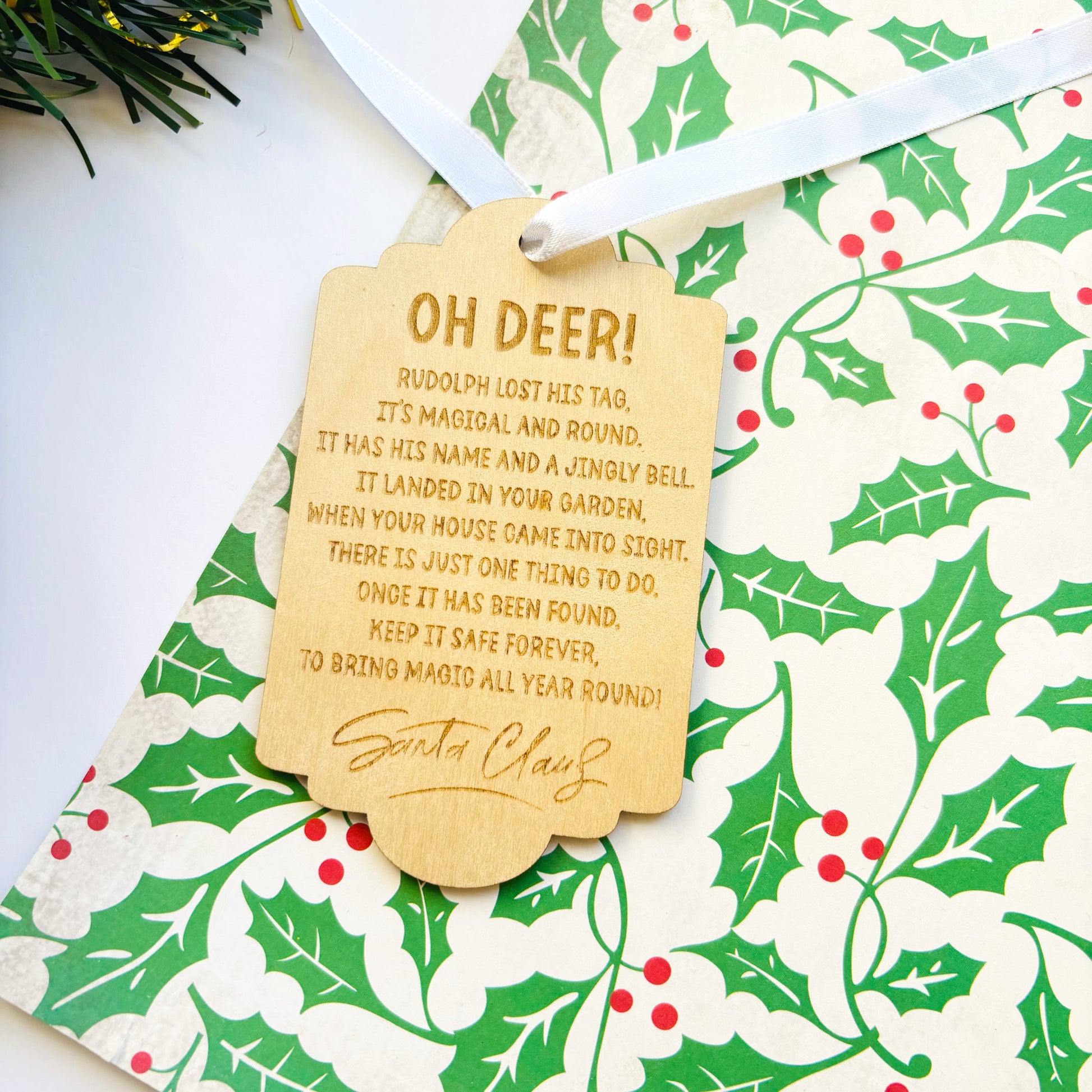Why not help Rudolph find his lost name tag! Each engraved red mirror name measures 3.5cm in diameter, and with a ring and bell - as though it fell right off Rudolph! Simply hide the name tag in the garden and leave the provided note out for your kids to find Christmas morning. Each engraved plywood note measures 6.5cm by 11cm - perfect to leave out or hang on the tree. Let the searching begin!
