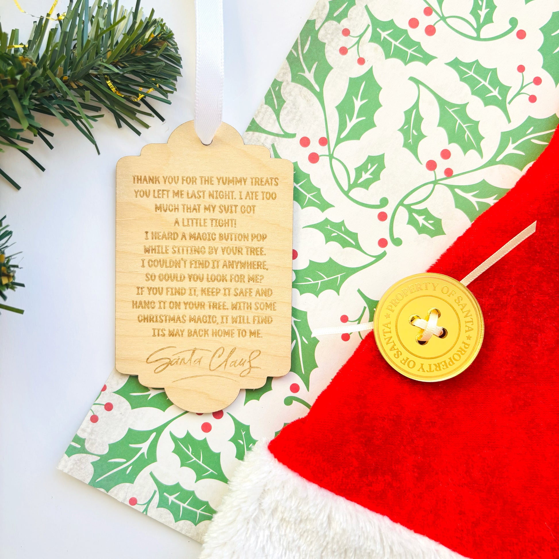 Why not help Santa find his lost button! Each engraved gold mirror button measures 4cm in diameter, and comes threaded with cream ribbon - as though it fell right off Santa's suit! Simply hide the button near the tree and leave the provided note out for your kids to find Christmas morning. Each engraved plywood note measures 6.5cm by 11cm - perfect to leave out or hang on the tree. Let the searching begin!