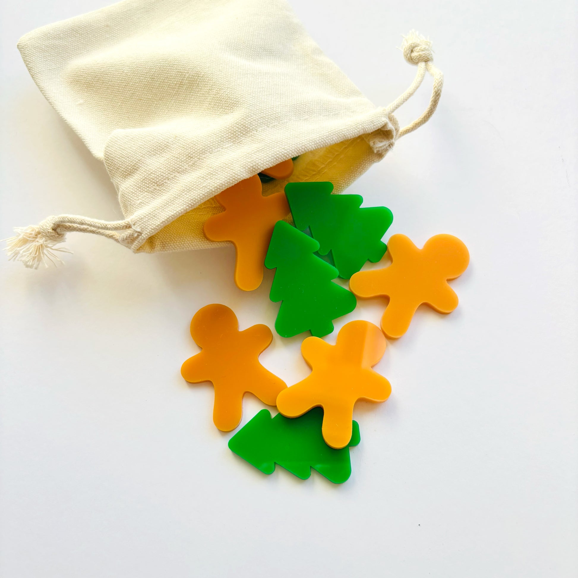Meet our Christmas tic tac toe! The perfect festive addition to a December 1st or Christmas Eve box to help get in the spirit! Each engraved 3mm plywood board measures 15cm square, and is paired with 5 acrylic Christmas trees and 5 acrylic gingerbread men in a calico storage bag.Â