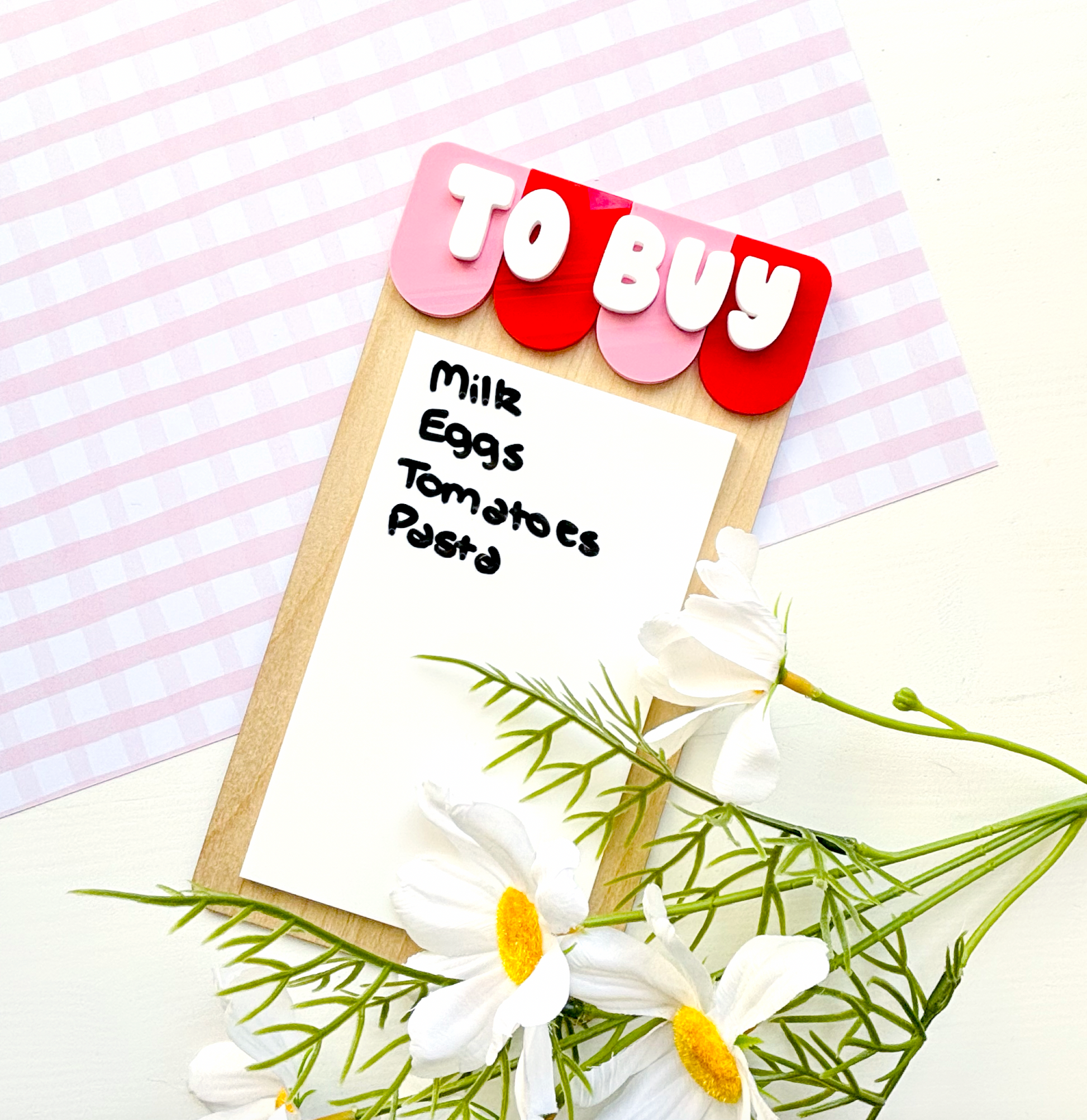 Crafted with plywood backings and layered acrylic details, each piece features white acrylic writing areas suitable for whiteboard or paint markers (like Posca), making them easy to update and reuse again and again. The “This Week” planner measures approximately 29.5cm wide x 21.5cm tall, the “Menu” planner 16cm wide x 22cm tall, and both the “To Do” and “To Buy” signs measure approximately 10.5cm wide x 20cm tall. Each piece is finished with scalloped headers in your choice of two acrylic colours and includes magnets on the back for easy display.